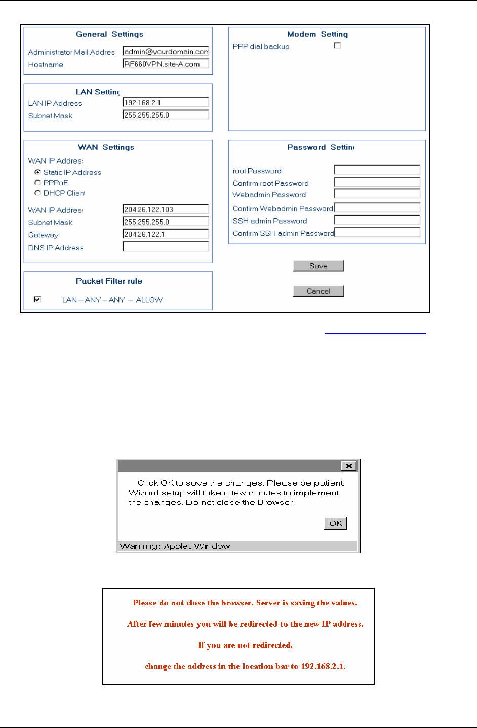 j) The following screen displays. Saving your settings will take a few minutes. Since you kept the LAN IP