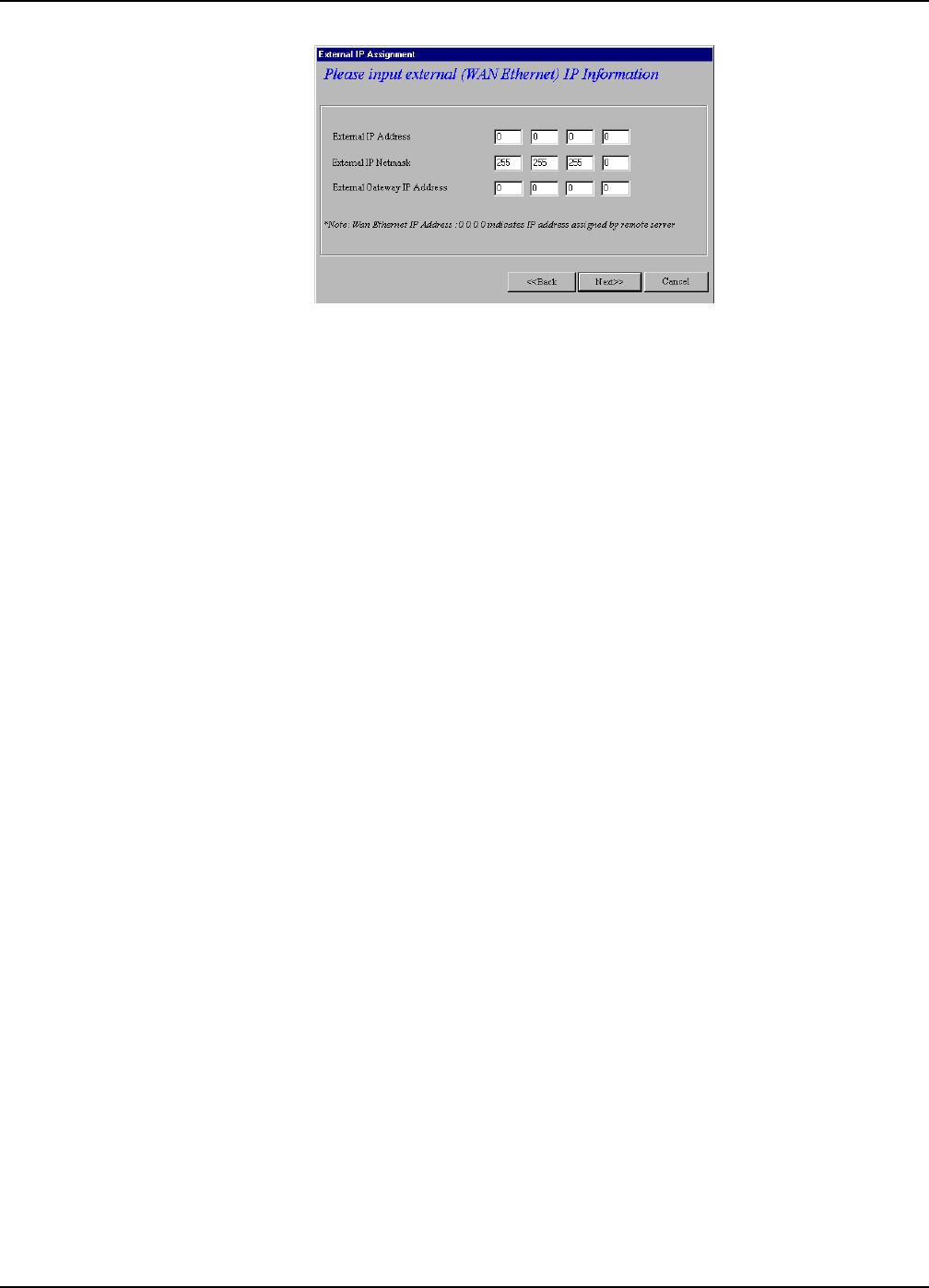External Gateway IP address at the default values of 0.0.0.0. Set the External IP Netmask to the